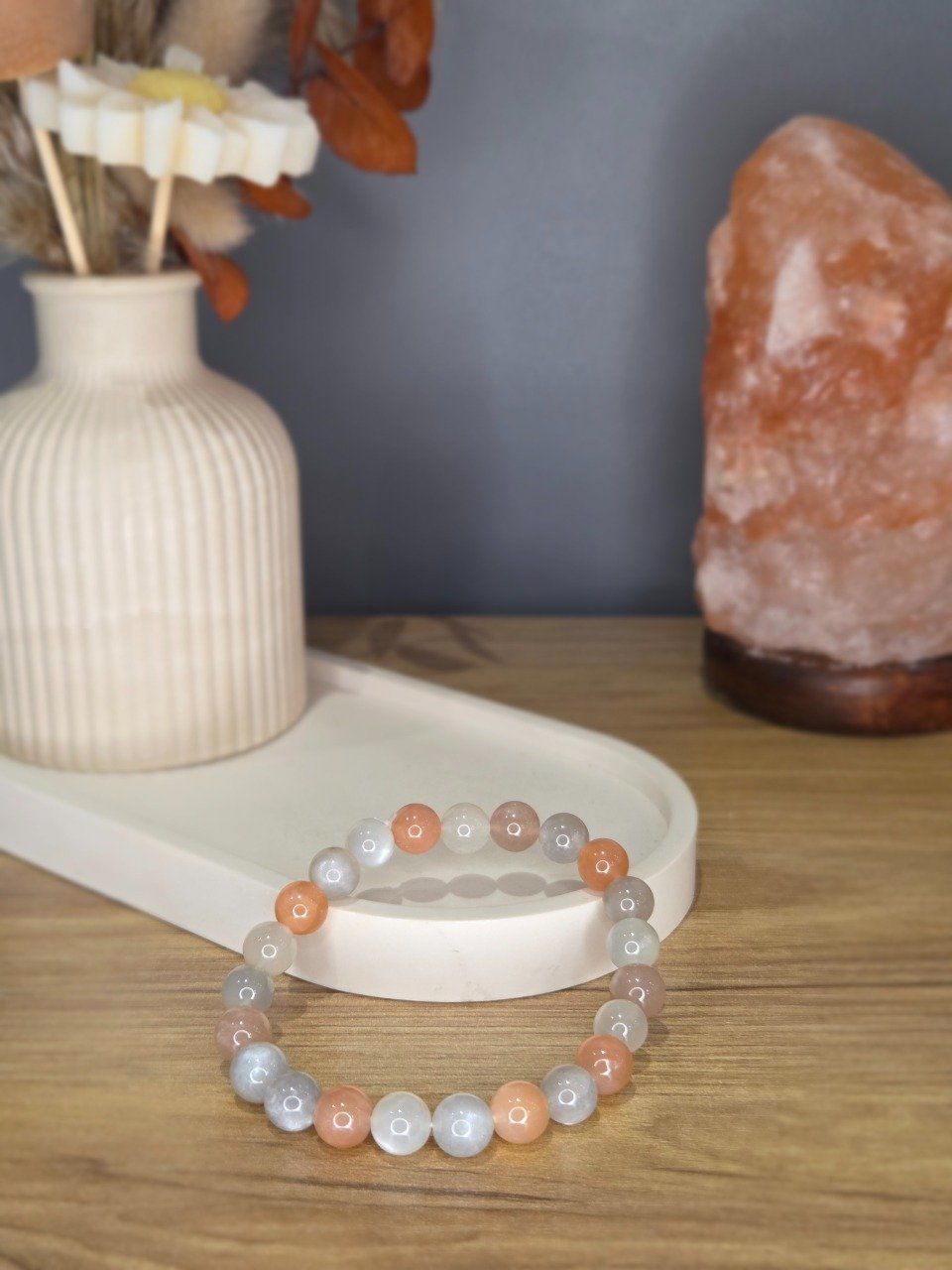 Ce bracelet en Pierre de Lune multicolore naturelle dévoile de superbes nuances de blanc, de beige, de pêche et de gris argenté, avec parfois de subtils reflets bleutés ✨. Réalisé à la main avec des perles de 8 mm, il est monté sur fil élastique solide et ajusté sur mesure pour un confort parfait.