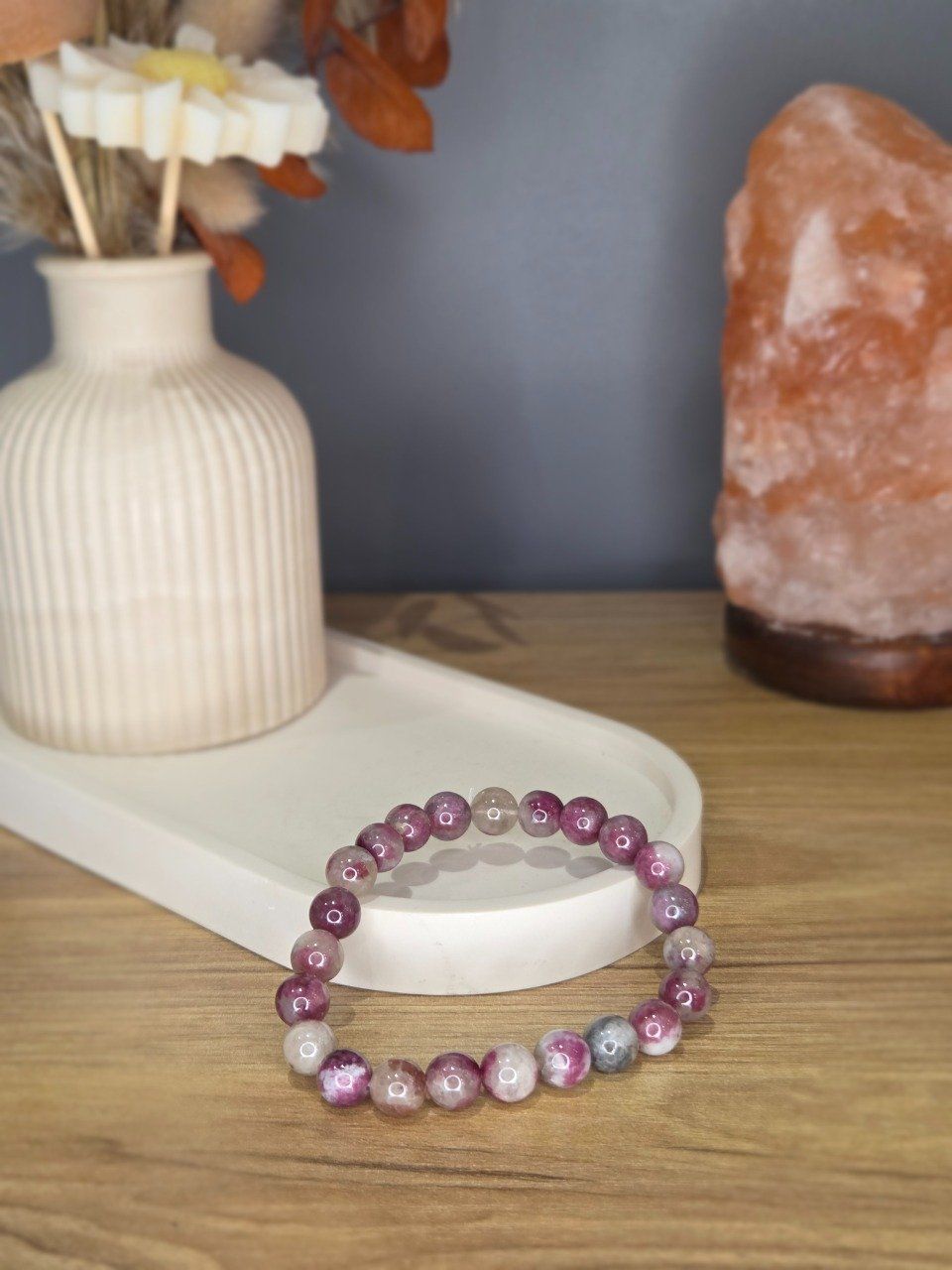 Ce bracelet en Rubellite naturelle (Tourmaline rose) charme par ses nuances profondes allant du rose framboise au rouge intense ✨. Réalisé à la main avec des perles de 8 mm, il est monté sur fil élastique solide et ajusté sur mesure pour un confort parfait.