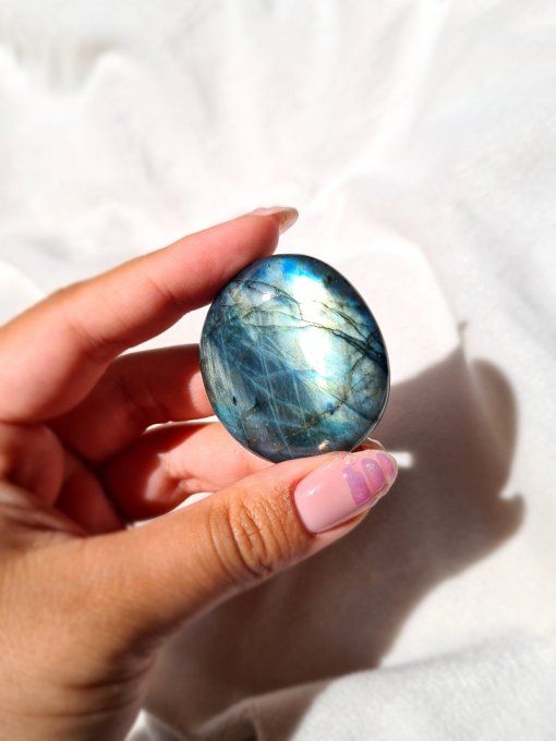 Galet en labradorite bleue, pierre de protection et d’intuition. Idéal pour repousser les énergies négatives, renforcer l’équilibre émotionnel et accompagner vos séances de lithothérapie. Pièce unique.