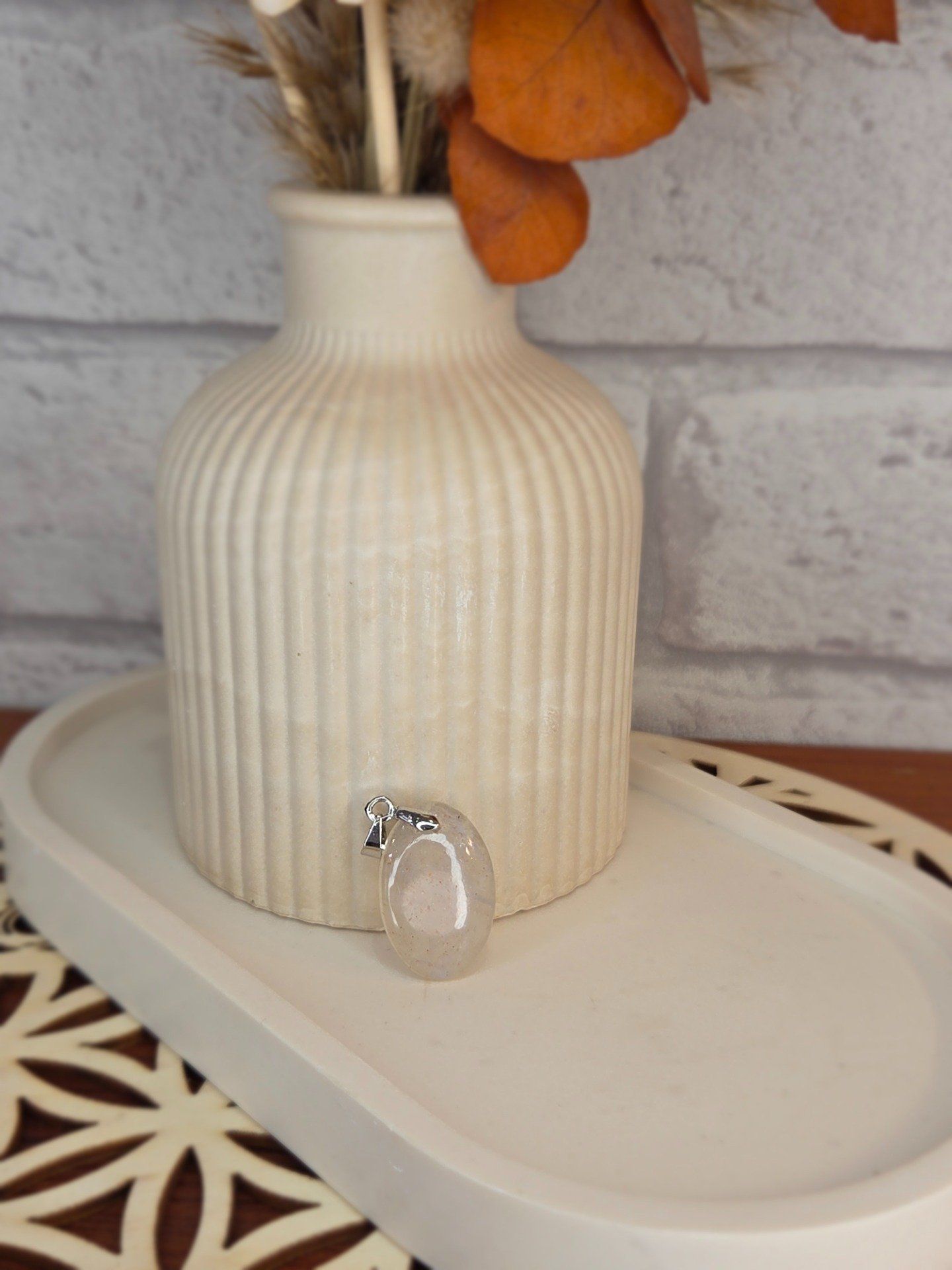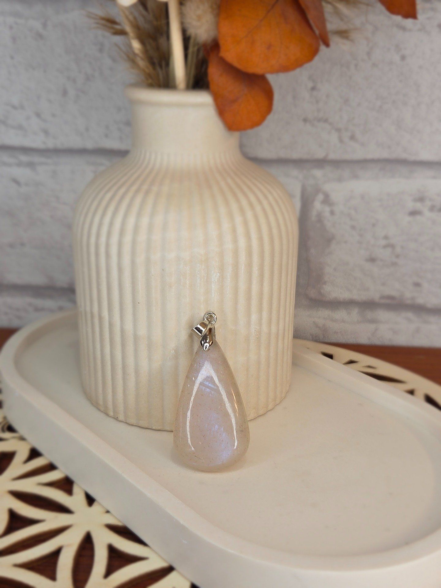 Pendentif en pierre de lune pêche, symbole de douceur, d’intuition et d’harmonie émotionnelle. Idéal pour équilibrer les émotions et favoriser l’épanouissement personnel. Pièce unique.